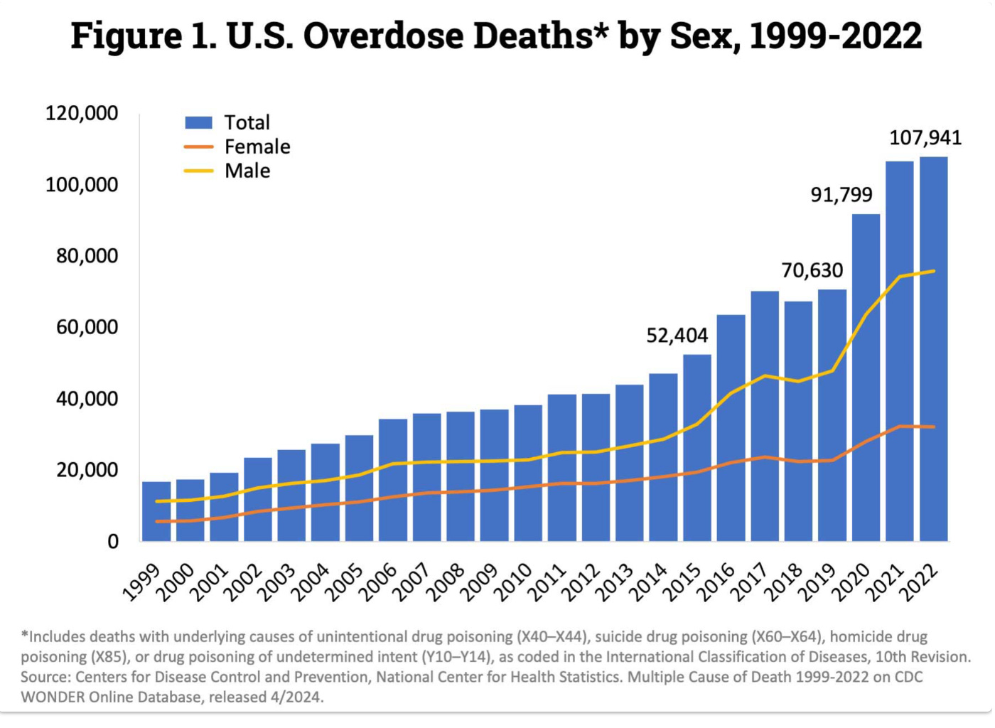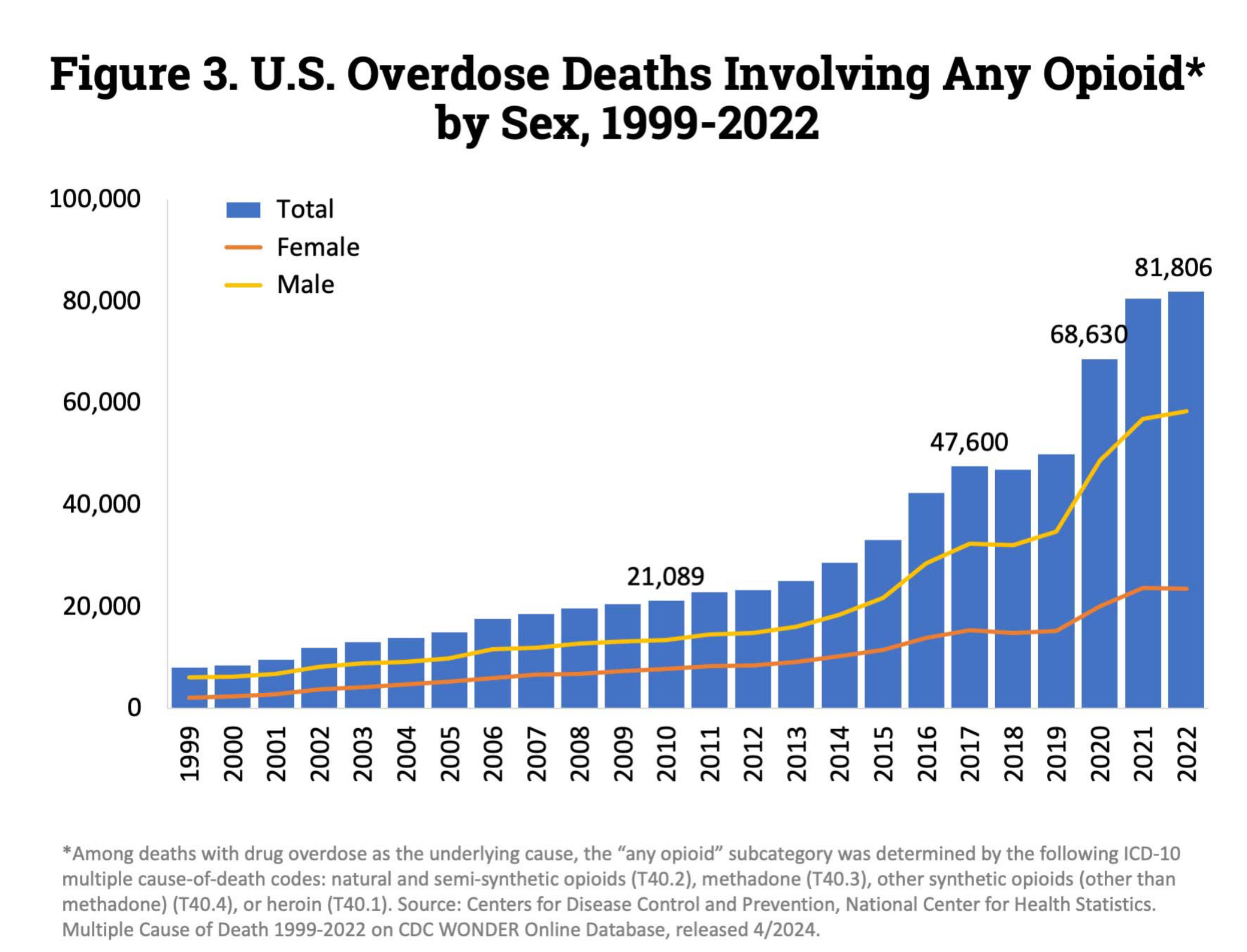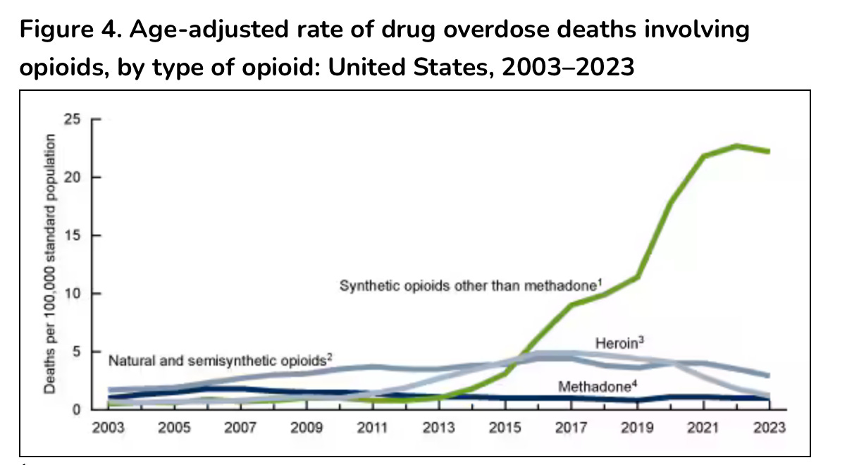This CDC chart shows just how dramatic and shocking the fentanyl epidemic has been for Americans. A drug which was a rounding error for deaths two decades ago now accounts for a majority of deaths, substantially pushing up mortality rates.