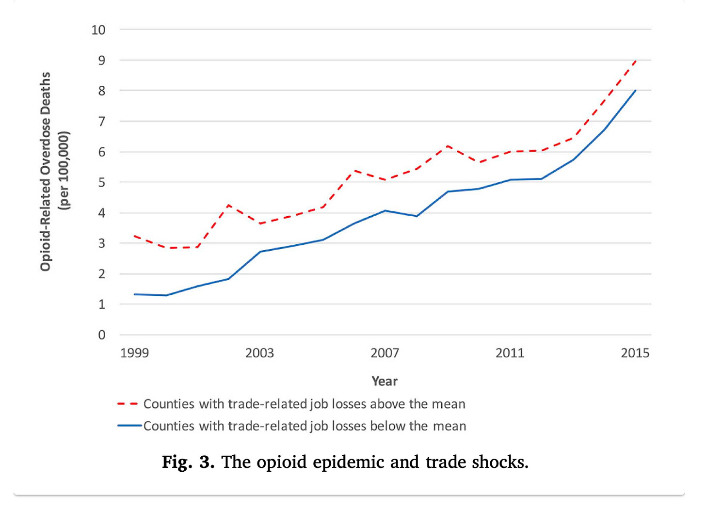 Dean and Kimmel (2019) note that "job loss due to international trade is positively associated with opioid overdose mortality at the county-level." These figures are significantly higher in counties with fentanyl use. The paper finds that for each 1,000 job losses, a 2.3 increase in county-level opioid deaths are found. But when fentanyl is in the local supply, an 11.3 percent increase in opioid-related overdose deaths are present.