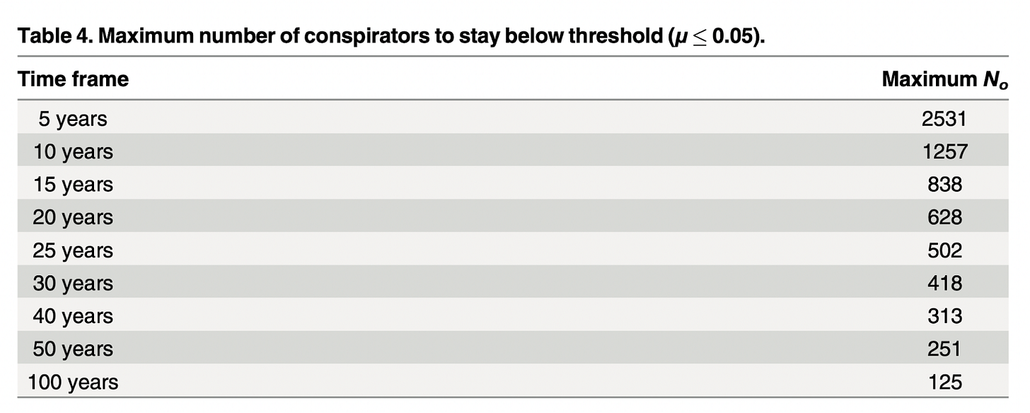 As we can see, the more people involved in the conspiracy, the harder it is to hide the truth. How did Grimes get these results? The simplified version is that this paper makes some basic assumptions about the odds someone in on a conspiracy will flip, then multiplies the chance they’ll flip by the number of people who know the truth, times the number of years. So, even if there’s a tiny chance anyone spills the truth, if you have a million people in on the conspiracy, it’s going to be revealed pretty fast. It’s pretty intuitive, and you can see the results in the table above.