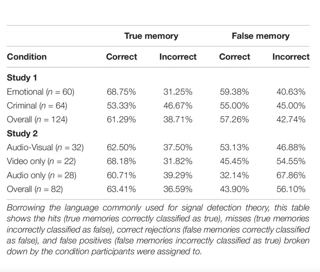 “The results presented here have direct implications for police and legal contexts. In addition to the risk of misidentifying false memories as true, the results presented here show the risk of misidentifying true memories as false – participants were no better than chance at correctly classifying true memories.”